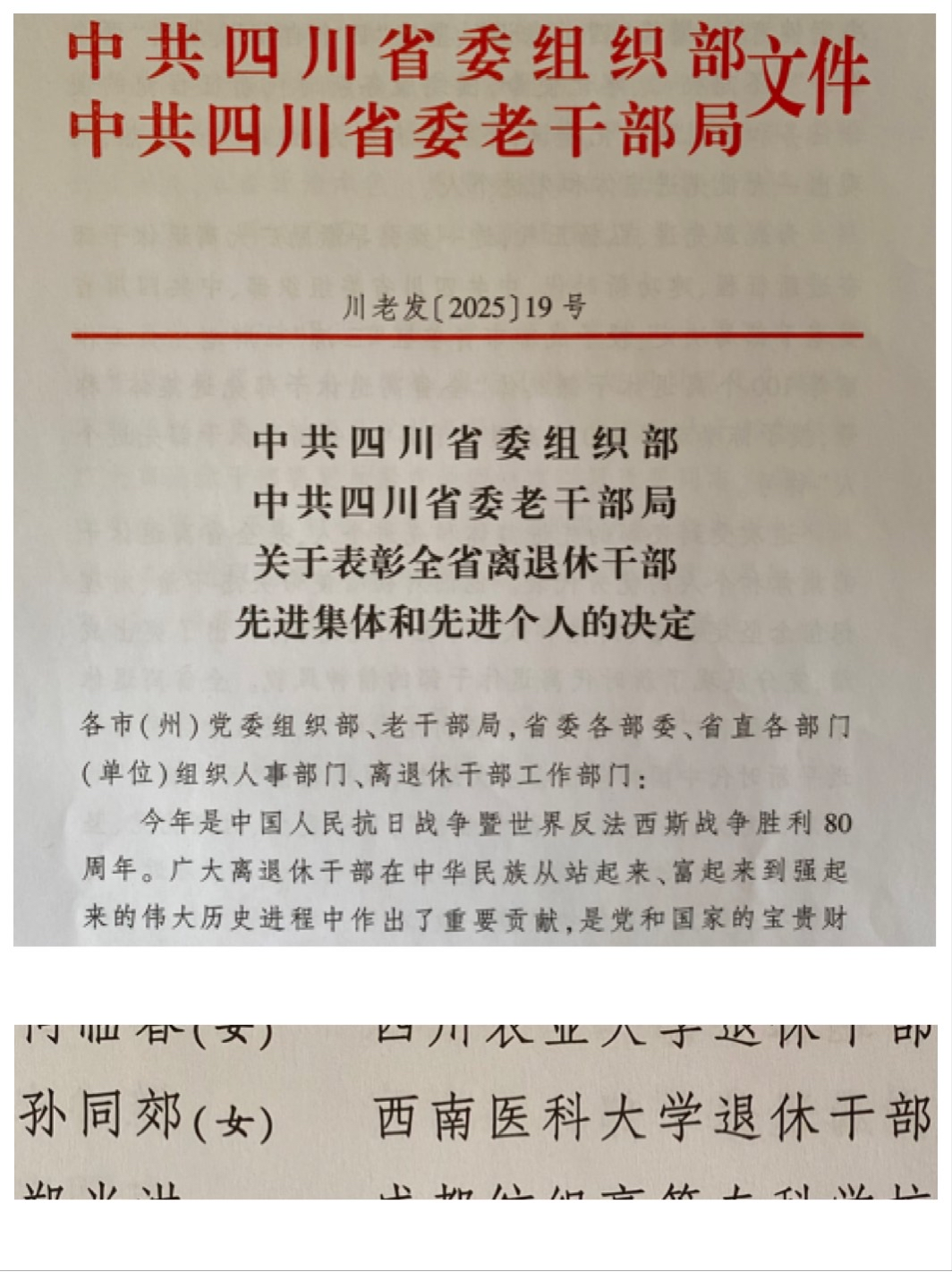 2月9日,全省离退休干部先进集体和先进个人表彰大会在成都召开。学校退休干部孙同郊教授荣获“全省离退休干部先进个人”称号,在会前作为受表彰代表接受省委书记王晓晖会见慰问。