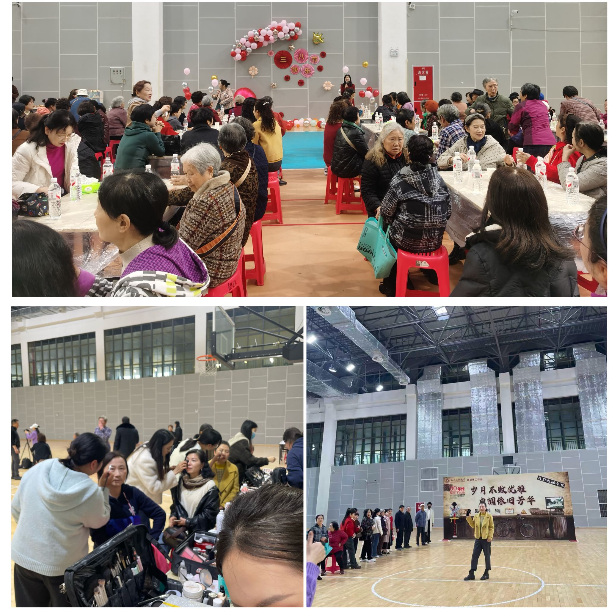 活动美妆区,专业团队为退休女老师精心装扮,看着镜中容光焕发的自己,老师们笑容洋溢,岁月不败芳华,优雅气度与精致妆容相映生辉。茶歇区,大家围坐品尝精致的点心,分享退休生活的点滴趣事,欢声笑语不断。拍照打卡区同样人气高涨,专业拍照团队热情引导,快门声中,定格了老师们优雅欢笑的美好瞬间;主题背景板复刻了80年代校园场景,老式自行车、荣誉奖状等老物件点缀其间,老校门的照片唤起大家对青春岁月的深情回忆。